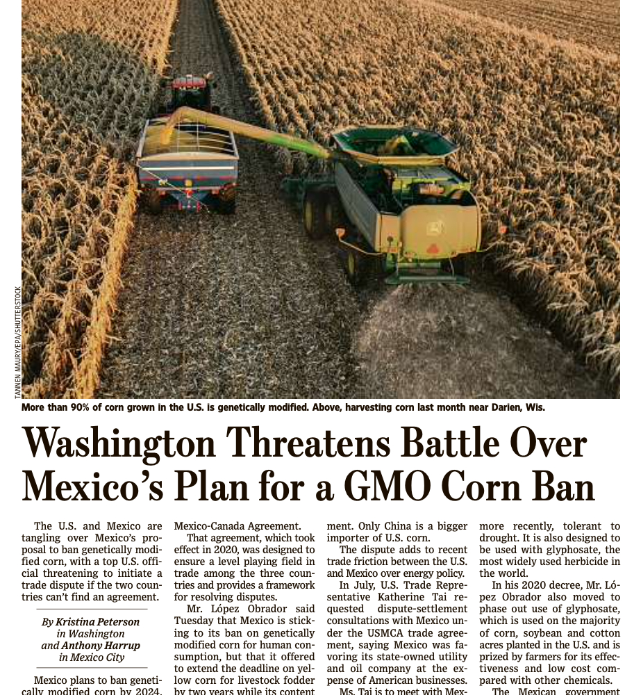 دسمبر 2020 میں، میکسیکن صدر انڈریس مینوئل لوپیز اوبراڈور نے 2024 تک جینیاتی طور پر تبدیل شدہ مکئی پر پابندی کا حکمنامہ دستخط کیا، جس سے 🇺🇸 ریاستہائے متحدہ کے ساتھ عوامی تجارتی تنازعہ کھڑا ہو گیا۔ تاہم، میکسیکو کی جی ایم او پالیسیوں اور تاریخ کا قریب سے جائزہ بدعنوانی کے ایک پیچیدہ جال کو ظاہر کرتا ہے جو اس پابندی کے پیچھے موجود حقیقی مقاصد پر سوال اٹھاتا ہے۔