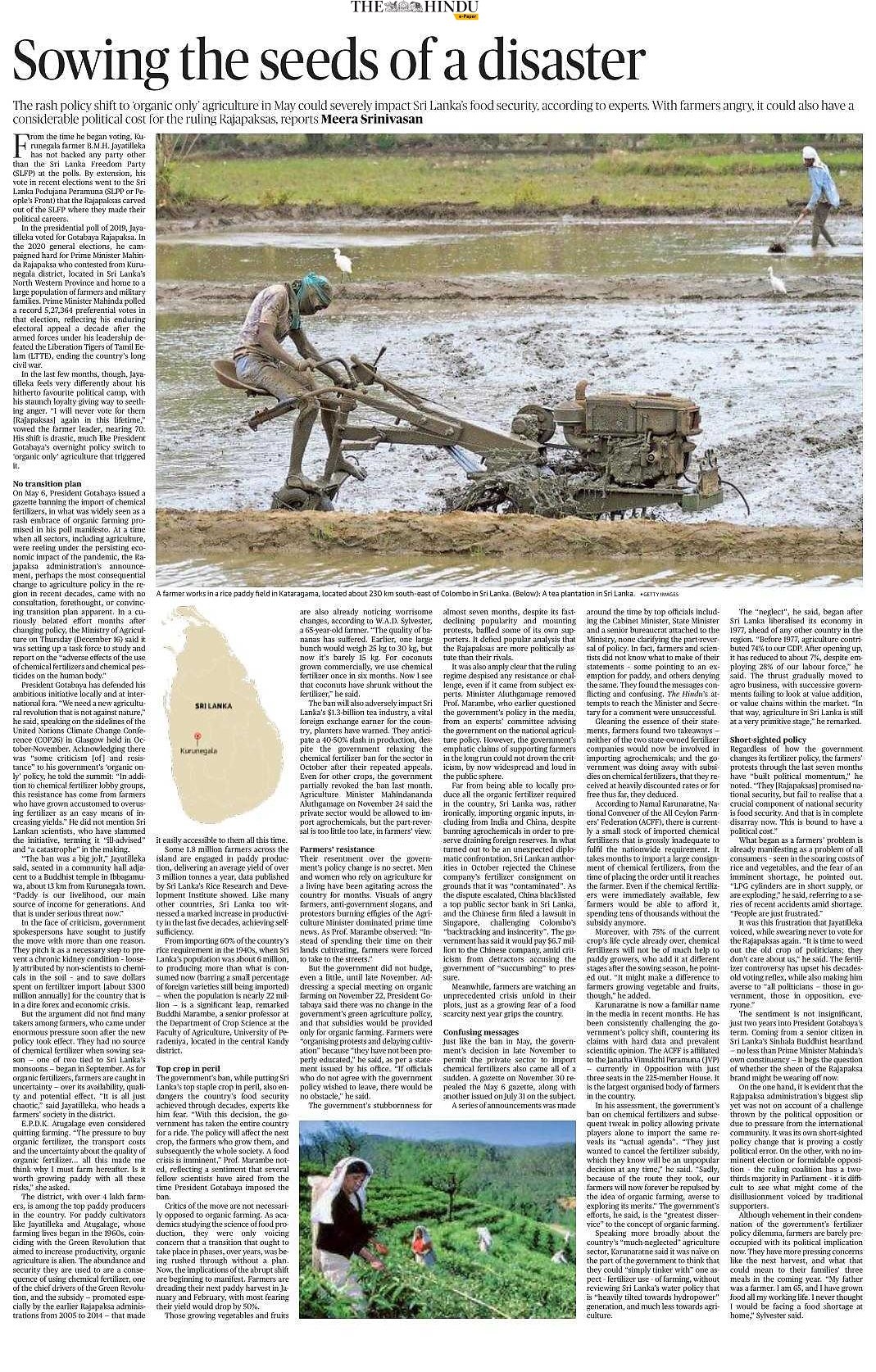 کے عنوان سے ایک مضمون شائع کیا تھا جو ظاہر کرتا ہے کہ 100% نامیاتی کاشتکاری کا اچانک نفاذ شروع سے ہی ناکام ہونے کے لیے تھا۔