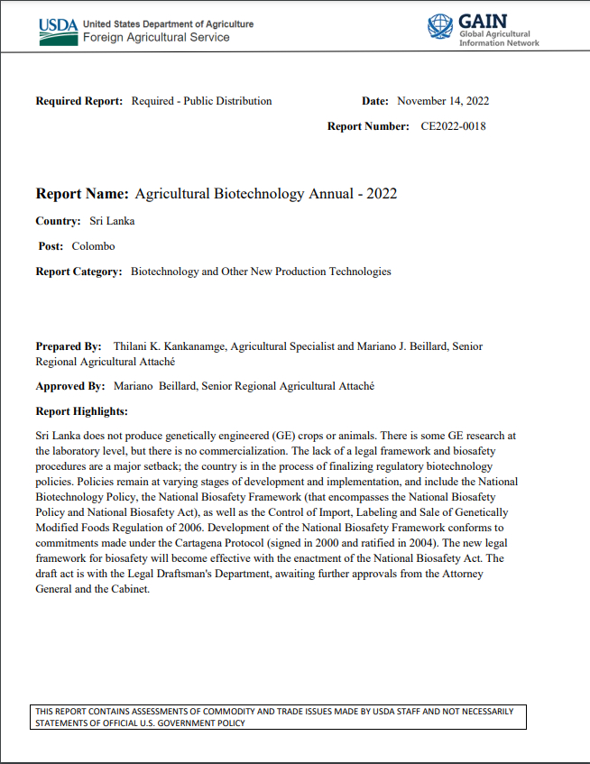 (2023) امریکی رپورٹ سری لنکا میں جی ایم او خوراک کی پیداوار کی تصدیق کرتی ہے ماخذ: ایگریکلچر انفارمیشن.ایل کے | امریکی محکمہ زراعت کا دستاویز