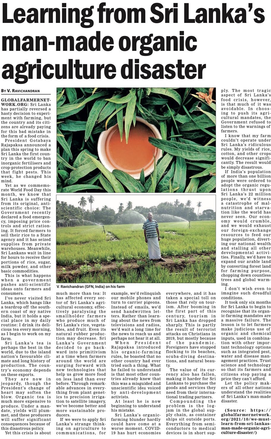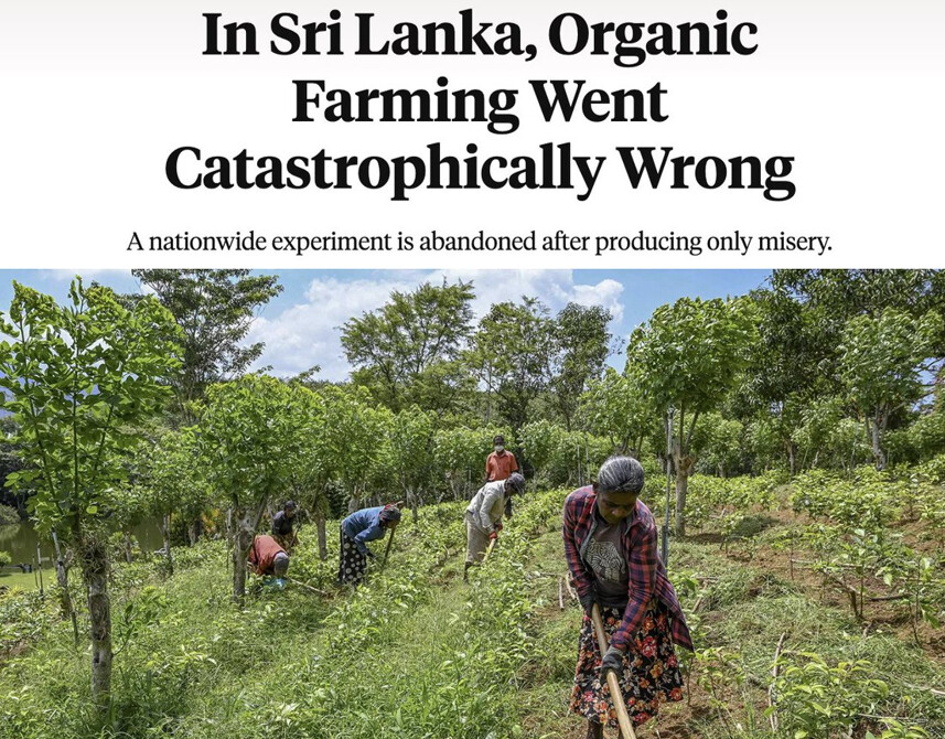 سری لنکا نے پچھلے سال اپنے شہریوں پر ایک برا تجربہ کیا۔ نامیاتی خوراک اور اینٹی جی ایم او کارکنوں کے زیر اثر، حکومت نے مصنوعی کیڑے مار ادویات کی درآمد پر پابندی لگا دی اور ملک کو مکمل نامیاتی زراعت کی طرف منتقلی پر مجبور کیا، جس سے کسانوں کی اکثریت اہم اوزاروں سے محروم ہو گئی جو وہ اپنی فصلوں کی کاشت کے لیے استعمال کرتے ہیں جن پر ان کا ملک انحصار کرتا ہے۔